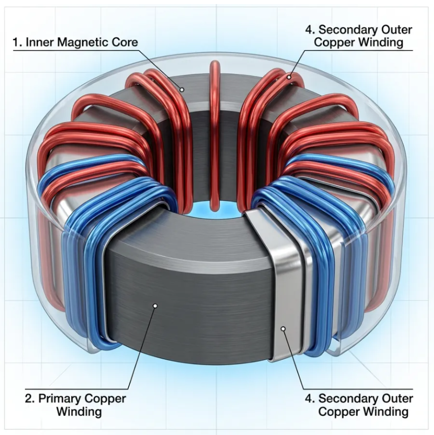- Flux Containment: The toroidal core efficiently channels this magnetic flux in a continuous loop
