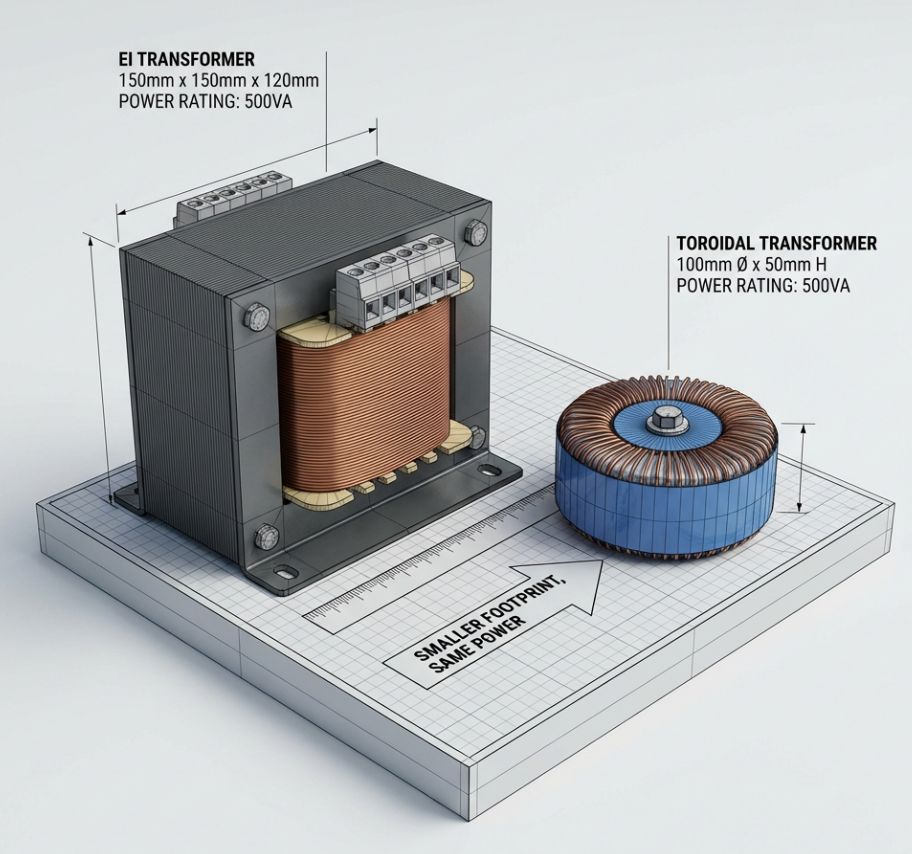 Practical example: A 500VA toroidal transformer might measure Ø120mm × 50mm, while an equivalent EI transformer could be 150mm × 130mm × 70mm.