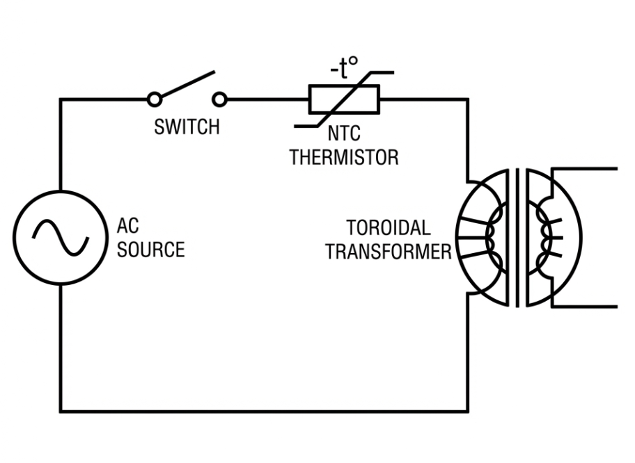 This is due to inrush current—toroidal transformers can draw 10-15x rated current for a brief moment when first energized. Solutions include using slow-blow fuses, time-delayed circuit breakers, NTC thermistors, or soft-start circuits.